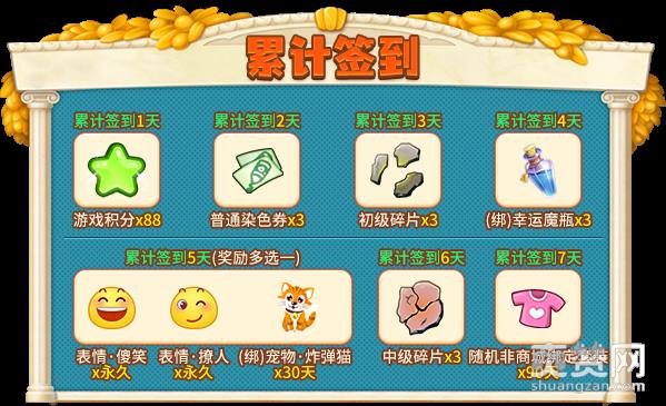 活动期间,700积分及以上的玩家每日签到可随机获得:粉、蓝、黄派对帽之一,有效期均为7天。