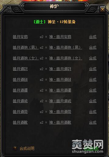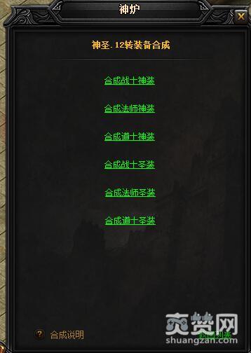 今天我们为大家介绍的主要是神圣·12转装备。打开神装·12转装备合成,我们会发现其中出现了6项。分别是合成战士神装、合成法师神装、合成道士神装、合成战士圣装(新)、合成法师圣装(新)以及合成道士圣装(新)。