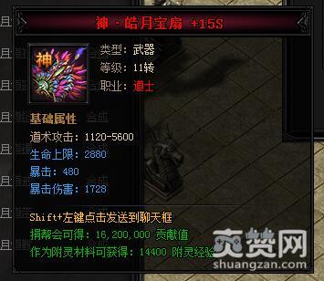 神·皓月宝扇。类型:武器,等级:11转,职业:道士。基础属性——道术攻击:1120-5600,生命上限:2880(蓝色),暴击:480(蓝色),暴击伤害:1728(蓝色)。捐帮会可得:16200000贡献值,作为附灵材料可获得:14400附灵经验。与同级别普通装相比,神装追加了三条蓝色特有属性。它们分别是生命上限、暴击以及暴击伤害。同时,捐帮会可得的贡献值比普通装增加了50%。