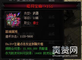 皓月宝扇。类型:武器,等级:11转,职业:道士。基础属性——道术攻击:1120-5600,捐帮会可得:10800000贡献值,作为附灵材料可获得:14400附灵经验。