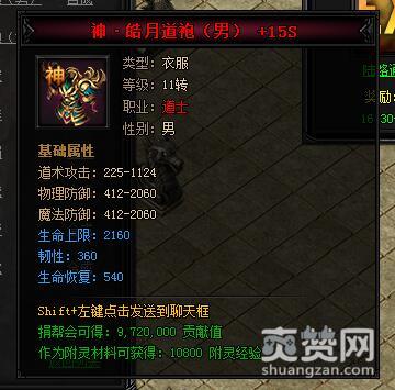 神·皓月道袍(男)。类型:衣服,等级:11转,职业:道士,性别:男。基础属性——道术攻击:225-1124,物理防御:412-2060,魔法防御:412-2060,生命上限:2160(蓝色),韧性:360(蓝色),生命恢复:540(蓝色)。捐帮会可得:9720000贡献值,作为附灵材料可获得:10800附灵经验。与同级别普通装相比,神装追加了三条蓝色特有属性。它们分别是生命上限、韧性以及生命恢复。同时,捐帮会可得的贡献值比普通装增加了50%。