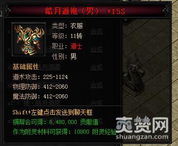 皓月道袍(男)。类型:衣服,等级:11转,职业:道士,性别:男。基础属性——道术攻击:225-1124,物理防御:412-2060,魔法防御:412-2060,捐帮会可得:6480000贡献值,作为附灵材料可获得:10800附灵经验。