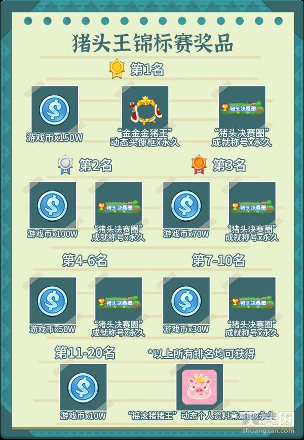只要在预选赛中完成10局比赛,无论是否获得名次,都能在比赛结束后获得“猪头王第二届锦标赛”永久纪念勋章一枚!