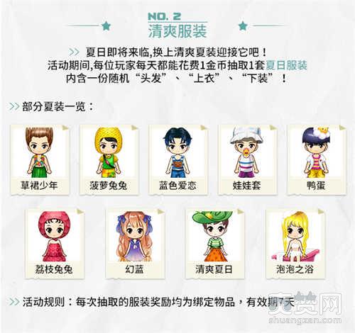 夏日即将来临,换上清爽夏装迎接它吧!活动期间,每位玩家每天都能花费1金币抽取1套夏日服装,内含一份随机“头发”、“上衣”、“下装”!