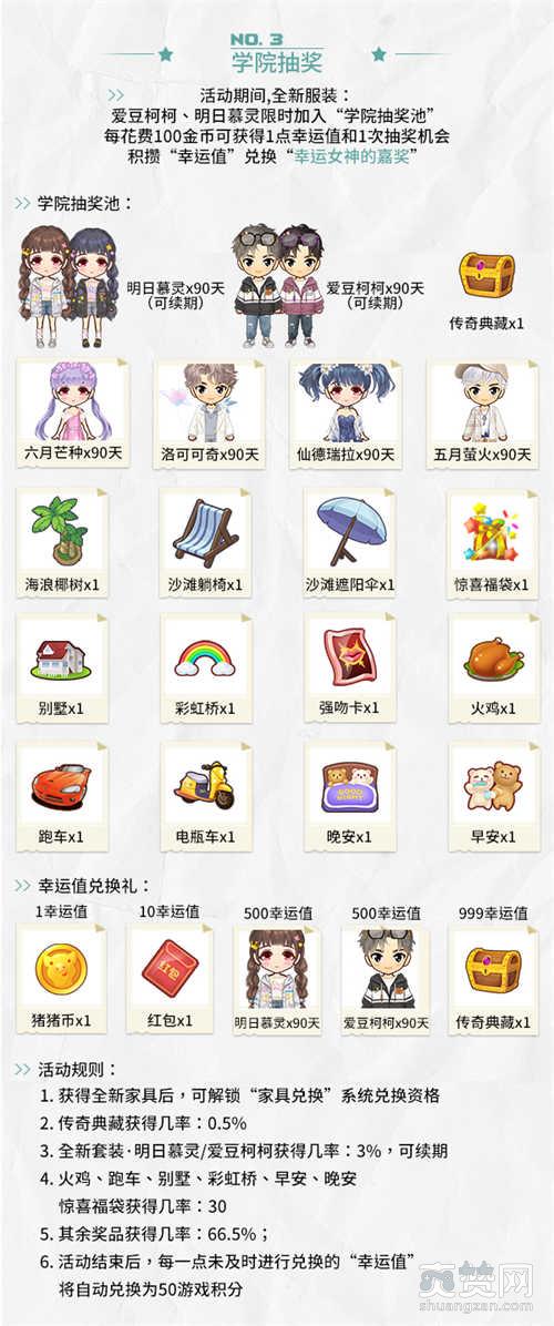 每花费100金币可获得1点幸运值和1次抽奖机会!积攒“幸运值”,兑换“幸运女神的嘉奖”!