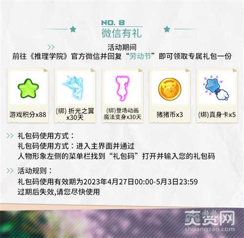活动期间,前往《推理学院》官方微信并回复“劳动节”即可领取专属礼包一份!