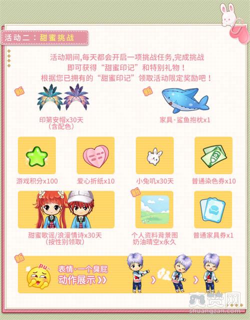 活动期间,每天都会开启一项挑战任务,完成挑战,即可获得“甜蜜印记”和特别礼物!根据您已拥有的“甜蜜印记”,领取活动限定奖励吧!