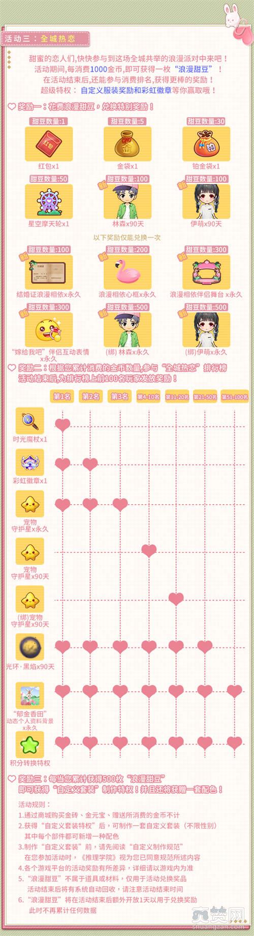 甜蜜的恋人们,快快参与到这场全城共举的浪漫派对中来吧!活动期间,每消费1000金币,即可获得一枚“浪漫甜豆”!在活动结束后,还能参与消费排名,获得更棒的奖励!超级特权:自定义服装奖励和彩虹徽章等你赢取哦!