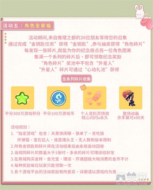 通过完成“金钥匙任务”获得“金钥匙”,参与抽奖获得“角色碎片”,每发现一张碎片,就能为你的纪念册点亮一位角色图案,集满一个系列的碎片后,即可领取纪念奖励!
