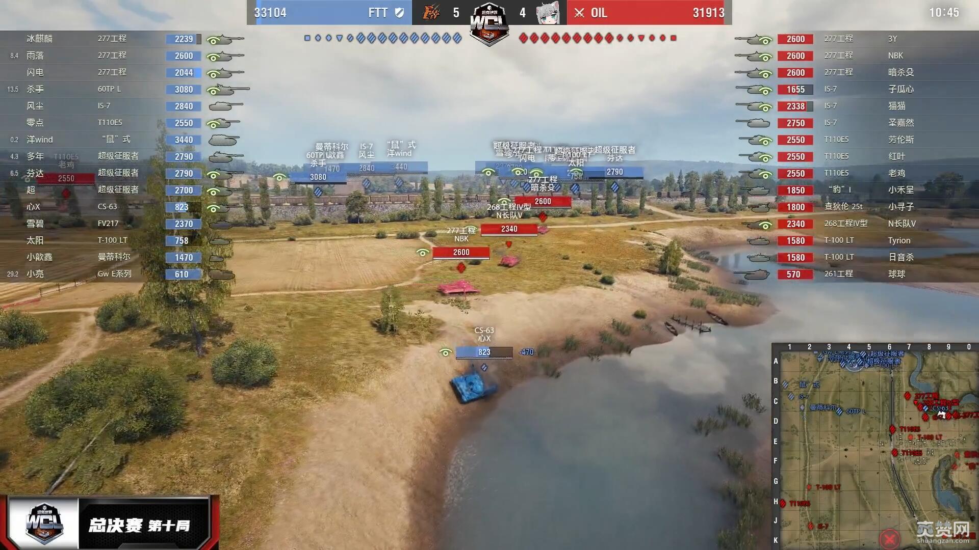 决胜局地图里夫奥克斯,在前10场战斗中获胜更快的OIL再次获得优先选边权,选定防守方。OIL以IS-7佯防城区、主力重防K线铁路与湖岸反斜面开局。而FTT在城市外围集结兵力后反复犹豫,最终未决定从1-3线发起强攻,转而斜插湖岸反斜面并助攻K线铁路,正中OIL下怀!