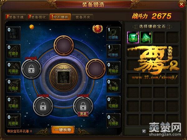 每件装备都有若干个宝石镶嵌孔,玩家可选择一件有多余镶嵌孔的装备,再点击界面右侧宝石栏中的宝石,即可将宝石镶嵌到装备上,提高玩家相应的属性。此外,给37《西游伏妖篇》里的装备开光还可以带来属性的飞跃式提升,但是只有橙色以上、且强化+10的装备才能进行开光哦!