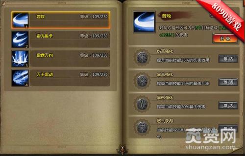 除了被动技能之外主动技能的重要程度也是不言而喻的,一共有四个技能分别是普攻、雷光振杀、雷霆万钧以及万千雷动,主动技能的等级跟人物的等级是相关的,人物等级越高技能的等级也会越高哦,主动技能最高可以达到230级哦。