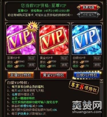 成为923yx《烈火战神》中的VIP,即可轻轻松松的快人一步。在923yx《烈火战神》中共有3种VIP——白银会员、黄金会员以及至尊会员,今天就来说说至尊VIP的妙用! 想成为至尊VIP,大家可以直接通过商城,在商场里购买,而且在刚开服的一两天内购买还有优惠哦!成为至尊VIP后,不仅在打怪方面会有经验增加,而且打宝的掉落率也会提高。
