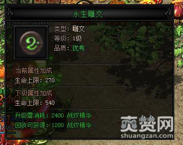 永生雕文。类型:雕文,等级:1级,品质:优秀,当前属性加成——生命上限:270,可以看出生命上限加成与点1个提升生命上限的天赋相比,要高出一些,尽管没有精良战纹加的那么多,但聊胜于无。而且雕文还可以升级,下一级的属性加成生命上限更是高达540,翻了一倍。升级需消耗:2400战纹精华,回收可获得:1200战纹精华。