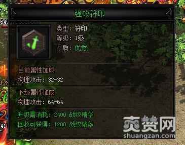 强攻符印。类型:符印,等级:1级,品质:精良,当前属性加成——物理攻击:32-32,如果你的角色是战士,那么使用这个战纹是非常不错的选择,因为它主加的物理攻击,而且加成属性值也比单点一个物理攻击的天赋高,下一级的属性加成物理攻击更是高达64-64。升级同样需消耗:2400战纹精华,回收可获得:1200战纹精华。