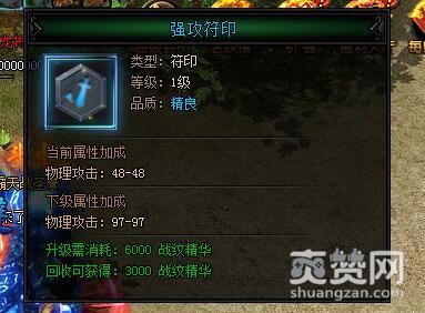 强攻符印。类型:符印,等级:1级,品质:精良,当前属性加成——物理攻击:48-48,如果你的角色是战士,那么使用这个战纹是非常不错的选择,因为它主加的物理攻击,而且加成属性值也比单点一个物理攻击的天赋高,下一级的属性加成物理攻击更是高达97-97。升级同样需消耗:6000战纹精华,回收可获得:3000战纹精华。