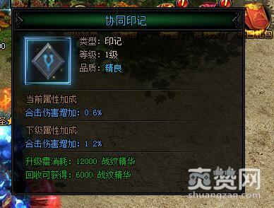 最后一个是协同印记,协同印记当前属性加成是合击伤害增加:0.6%,下级属性加成是合击伤害增加:1.2%,升级需消耗:12000战纹精华,回收可获得:6000战纹精华。合击的作用就是和你的英雄两人发起合击技,合击技有冷冻CD,一旦CD满了就能释放强大的攻击,这种攻击比暴击更强,一击之下就能打出平时3倍、乃至4倍的伤害。再加上这个战纹,对敌人,特别是BOSS的伤害值更是锦上添花。