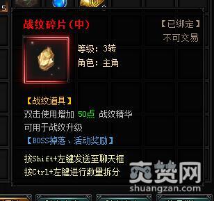 实际测试中,掉落率最高的就是战纹碎片(中),而且一次性掉落的量也非常多,往往是几个,十几个一下子。战纹碎片是通过双击使用的一种战纹道具,中型的使用后会增加50点战纹精华,可用于战纹升级。