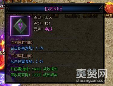 最后一个是协同印记,协同印记当前属性加成是合击伤害增加:1.0%,下级属性加成是合击伤害增加:2.0%,升级需消耗:24000战纹精华,回收可获得:12000战纹精华。合击的作用就是和你的英雄两人发起合击技,合击技有冷冻CD,一旦CD满了就能释放强大的攻击,这种攻击比暴击更强,一击之下就能打出平时3倍、乃至4倍的伤害。再加上这个战纹,对敌人,特别是BOSS的伤害值更是锦上添花。