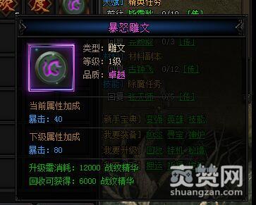 小编在实际测试中,真的掉落了一个紫色的卓越战纹。是暴怒雕文,卓越品质的它当前属性加成暴击增加40点,下级更是增长一倍,高达80点暴击。