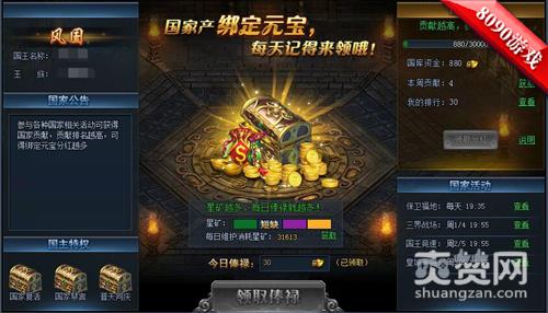第二个比较有特色的玩法就要属国家玩法了,在这里大家可以根据自己的喜好进入不同的国家,在这里参与各种国家相关的活动就可以获得国家贡献,贡献排名越高可以获得分红的绑定元宝也会越多哦。