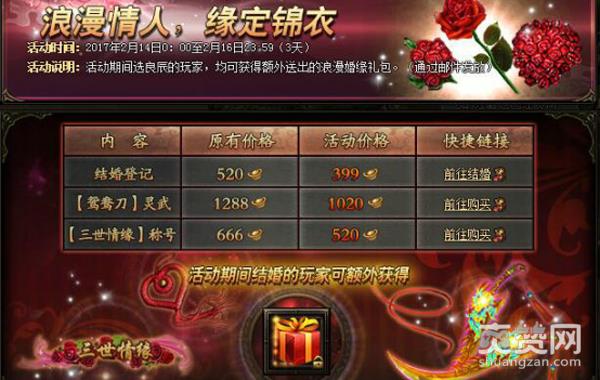 不缺鲜花,唯有浪漫,在这个浪漫情人节,有什么比情侣装更让你们显得登对和相称?默契的操作,形影不离的组队,灵武时装的出现,让英雄与红颜的情愫尽在不言中。时逢岁末,天赐情缘,穿上灵武鸳鸯,在这个《锦衣夜行》勾画出属于自己的风景线。结婚登记、灵武——鸳鸯刀、三世情缘称号通通打折出售!想获得更大的惊喜吗?赶快和你的心上人一起来吧!