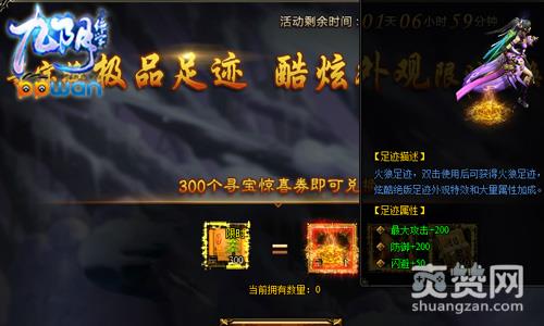 除了玩家梦寐以求的神兵,活动期间内玩家每寻宝10次就可以获得一张寻宝惊喜券,当玩家集齐在ppwan《九阴绝学》中集齐300张寻宝惊喜券时,玩家就可以在绝版外观界面兑换全新的外观足迹——火狼足迹、大量的灵魂原石和银票。玩家在得到超炫外观特效的同时还能获得大量属性加成以及大量的金钱。时间有限,这样给力的超值活动你还在等什么呢?