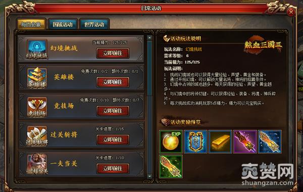 做日常任务,顺便领取福利吧!跑商、培养将领、升级、强化……,这些在《热血三国3》之中想要变强就必做的事情,做完了还能获得额外的奖励?在游戏中,通过日常活跃界面,我们可以通过完成一些简单要求,稀世珍宝、黄金、器灵、紫装等奖励,都可轻易领取!而想得到这一切,所需要的只是正常的玩游戏就可以了!