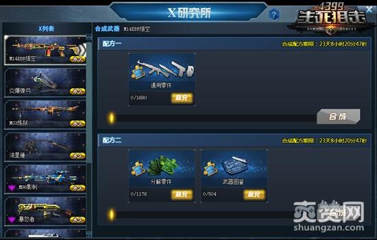 有了通用零件的小伙伴们,在游戏界面“精彩活动”下面就可以看到“X研究所”的入口啦。在X研究所里,大家可以用收集到的通用零件合成各种武器,包括M14EBR悟空、炎爆弹弓、MG3炼狱、流星锤、M96影刺、暴怒者、白银沙鹰、白银M4A1、白银AK47、激光剑。