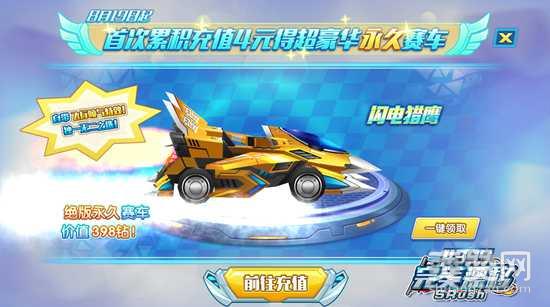 进入游戏后的右上角选择首冲礼包图标,点击进入活动界面,首充礼包赠送的闪电猎鹰是一款自带飞行喷气特效的赛车,而且价值398钻石,现在首充就可以获得,玩家们可不要错过了。