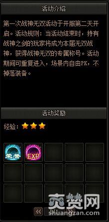 壮志饥餐胡虏肉,笑谈渴饮匈奴血,在923yx《战天》战神无双中所需要的正是这种豪情壮志!在923yx《战天》战神无双中大家不仅能激情PK,展现真正的实力,还可以获得大量经验和荣誉!战神无双活动每天14:00-14:05为进场时间,在沙漠土城战神无双管理员处进入擂台。14:05开始至14:30结束,在活动开始后,击杀战神阿瑞斯,必定掉落战神之剑,拾取战神之剑,将获得“神”称号,持有这个称号的玩家每5分钟获得一次随机奖励。