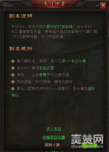 当玩家达到一定等级时,可点击游戏右边“激战BOSS”,选择“超级BOOS”参与末日秘境,此时会出现进入末日的选项,但是进入副本需要道具“末日令牌”,如果没有令牌是无法进入的哦,直接在右边点击“购买令牌”,就可以花费300绑元购买了,购买后会随机传送到168层的某一层,越往后的BOSS越强力,并且出高级装备的几率越高。进去后,还可以通过“鼓舞战斗”与“高级鼓舞”提升自己的攻击力,使击杀BOSS更加效率;