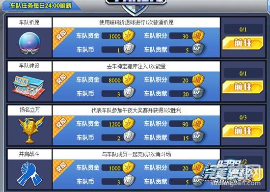 2、车队任务:车队任务每日24:00刷新,完成对应的任务可以获得不同的奖励。
