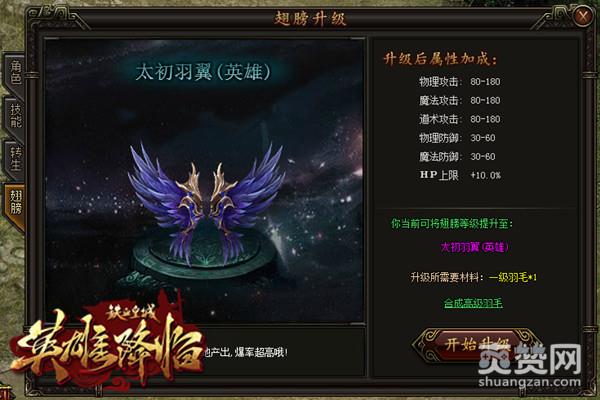 而英雄翅膀系统升级所需的羽毛也主要通过打boss随机获得,并且打boss获得的羽毛均为初级羽毛,初级羽毛可与元宝一起可合成高阶羽毛。