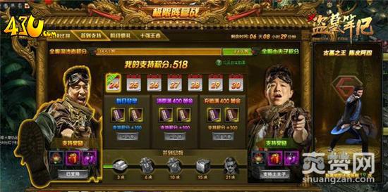 阵营战是43u《盗墓笔记》中非常受玩家喜欢的玩法之一,活动中分了两个阵营,淘沙者和土夫子,玩家们选择一个自己要支持的阵营,就可以领取支持奖励。奖励都为4级宝石袋,属性丹药包2个以及3倍经验药2个。