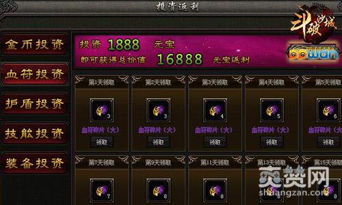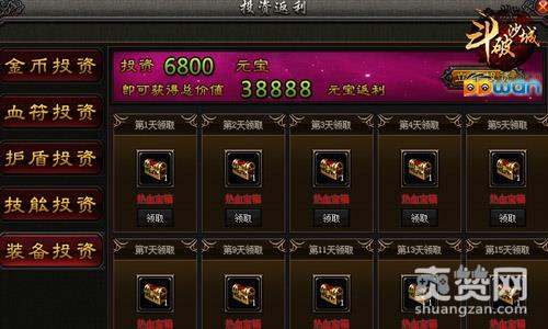 在ppwan《斗破沙城》中,五大投资返利分别为金币投资、血符投资、护盾投资、技能投资和装备投资。金币投资非常常见,即投资12888元宝后,15天共将获得总价值为88888的元宝返利。玩家每天都可以领取不菲的金币且数量越来越多,让你再也不用担心金币不够用了!