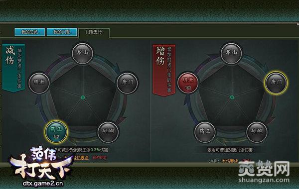 门派五行是《范伟打天下》最新推出的玩法,修炼之后玩家不但可以在对阵某个门派时增加对敌伤害,还可以针对性地减免来自特定门派的伤害,增减之间实力将会提升N个档次。