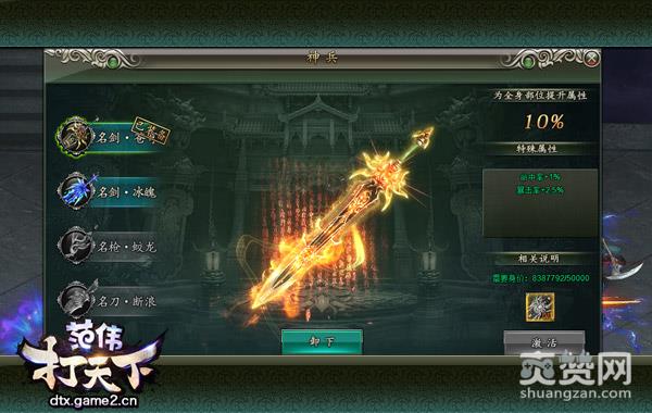 哥们网《范伟打天下》的四把神兵激活条件不一,但是大部分神兵的激活条件都是非常容易的。例如: