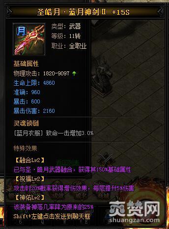 圣皓月·蓝月神剑II。类型:武器,等级:11转,职业:全职业。基础属性——物理攻击:1820-9097。生命上限:4860(蓝色),准确:960(蓝色),暴击:600(蓝色),暴击伤害:2160(蓝色)。灵魂锁链——【蓝月衣服】:致命一击增加3.0%。特殊效果——【融合Lv2】:已与圣·皓月武器融合,获得其150%基础属性。【祝福Lv2】:攻击时20%概率获得增伤效果,每层提升5%伤害。【神佑Lv2】:该装备掉落几率降为原来的25%。