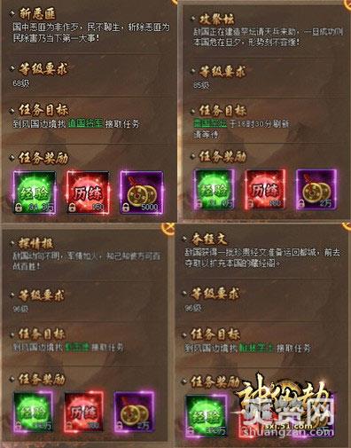 51《神仙劫》国家战事任务分为:破魔障、斩恶匪、攻祭坛、探情报、夺经文。 等级达到要求后,即可在国家战事页面上领取相对应的任务。完成任务可获得经验值、历练值以及装备升阶道具等奖励,祝你战力飞升!