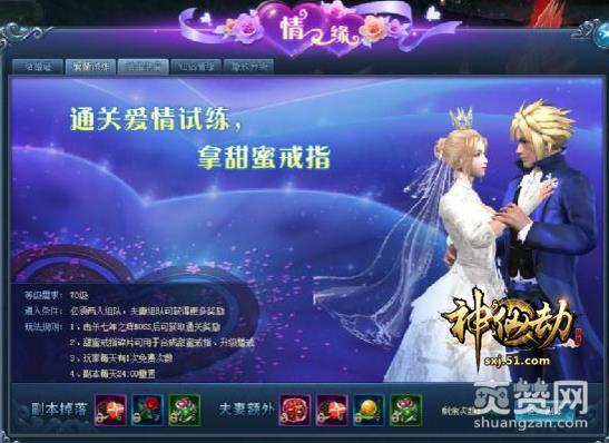 三月春暖花开,万物复苏,又到了收获爱情的季节。一场浪漫的爱情总是从美丽的邂逅开始的,也许某个明媚的下午,在51《神仙劫》中,你和他(她)不经意间相遇、相知,续写一段浪漫情缘。只要你们双方都是单身、互为好友、互为异性、等级70级以上,拥有1枚甜蜜戒指即可前往NPC(瑶姬)处进行领证结婚。