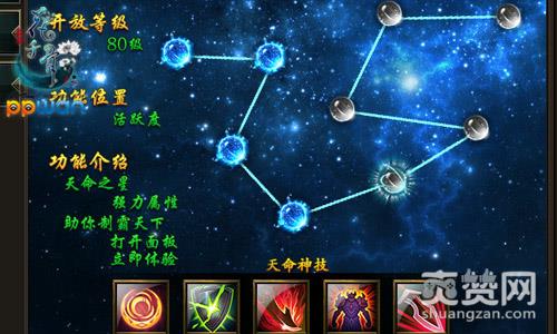 天命之星共有九重天,当仙友将一重天的九颗星全部激活后就可以进入第二重天,激活第二重天的天命之星。在ppwan《花千骨》中,每激活一颗星都会为仙友带来各种属性的永久加成。当仙友激活二重天一星时还可激活五大天命神技之一的天命之攻,可增加30%天命已激活的攻击。