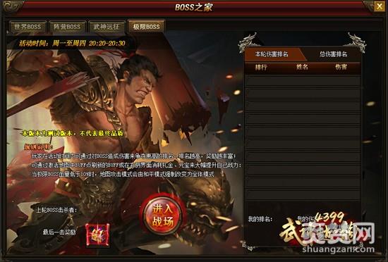 在《4399武神赵子龙》BOSS之家中,就可以看到全新推出的“极限BOSS”玩法。极限BOSS活动时间为周一至周四,每天晚上20:20-20:30。