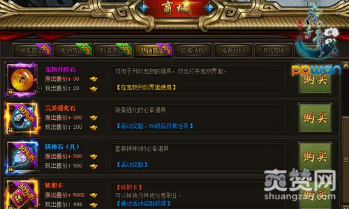 热销商店堪称ppwan《花千骨》中的百货店,各种热销商品里面应有尽有,时装升级石、宠物升阶石、完美强化石、铸神石、转职卡……这里你都可以买到。品质保障,价格美丽,特别是转职卡、铸神石、完美强化石、3倍经验丹,这些珍贵的游戏道具在这里都是3折出售哦,想买就赶紧下手吧!