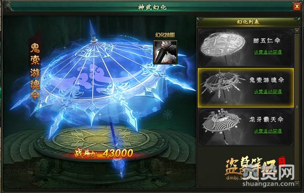 神武开启幻化后,即可获得幻化技能。目前游戏中神武幻化总共有三种幻化神武。甜五仁伞幻化技能花前月下可提高主角0.5%卓越一击概率、鬼索游魂伞幻化技能破釜沉舟可提高主角3%致命一击概率、龙牙舞天伞幻化技能与前者相同,但技能概率提高5%。三大神武均可通过运营活动获得。