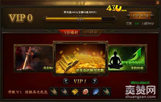 成为VIP的玩家可以领取VIP经验BUFF,每小时可获得二倍经验,累计充值元宝到对应数额,就可以自动开通对应VIP等级。其实只要充值1元RMB就能获得VIP1啦!玩家们随着VIP升级还会得到大礼包,获得与众不同的VIP特权,VIP等级越高,特权就越强。
