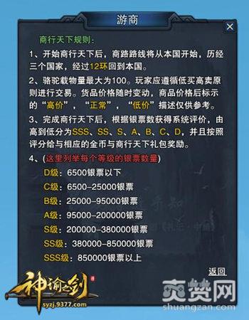 玩家在游戏中开始9377《神谕之剑》商行天下任务后,商路路线将从本国开始,经历三个国家,经过12环回到本国。骆驼载物重量值为100。在游戏中,玩家应遵循低价买高价卖的原则。而完成商行天下任务后,系统会根据获得银票的金额评价,由高到低分为SSS,SS,S,A,B,C,D,并且给出相应的礼包以及金币奖励。