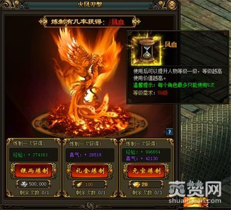 1,玩家每天都有银两炼制,礼金炼制,元宝炼制凤血的机会