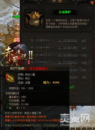 然而,9377《赤月传说2》近期的一次更新打破了这种磨人的困境。在游戏里,神装备已经不再是顶级装备了,圣装备荣登“皇者”宝座。与以往一样的是,玩家依然需要在土城NPC合成神炉出进行合成,合成需要2个相同的神级装备,再加上一些炼狱圣石就可以合成。