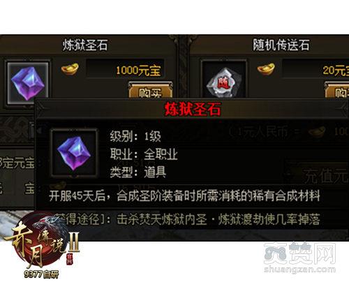 在9377《赤月传说2》里,玩家合成圣装必不可少的道具是——炼狱圣石。玩家击败十二转地图【焚天炼狱】内的【圣·炼狱渡劫使】就有几率掉落,懒得刷材料的土豪玩家还可以花1000元宝在商城中进行购买。